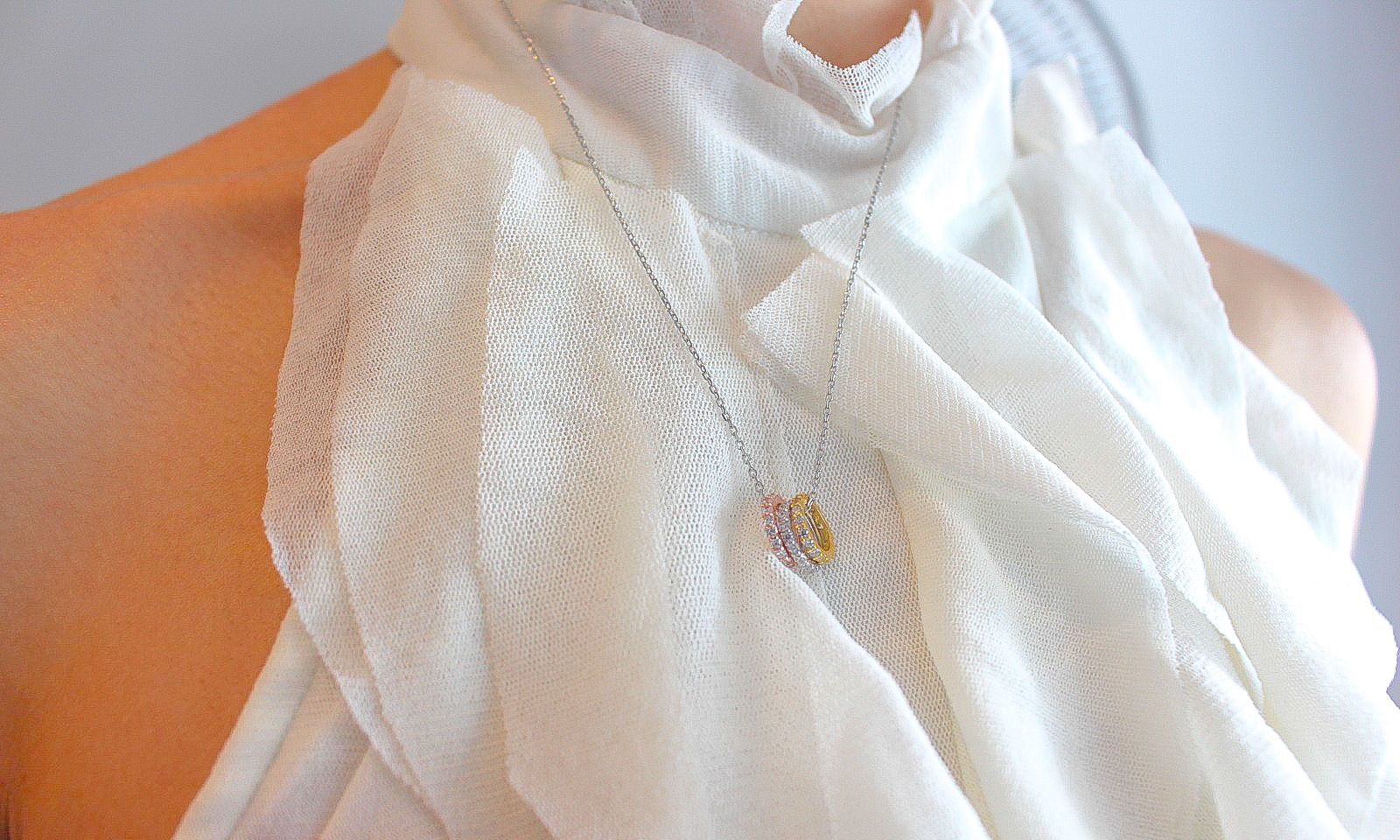 This sterling silver Tri Colour necklace is perfect for a night where you will be in a place with good lightning. The gold, silver and rose colour of each piece reflect in the light and bring that extra shine needed for a beautiful necklace.